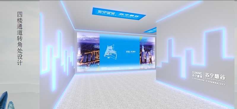 美湖展覽設計公司參與了南京蘇寧慧谷甲級寫字樓樣板房樓道的展廳設計,通過藍色和白色相間的策劃,凸顯了蘇寧睿城所追求的目標是和業主共贏的生態鏈.