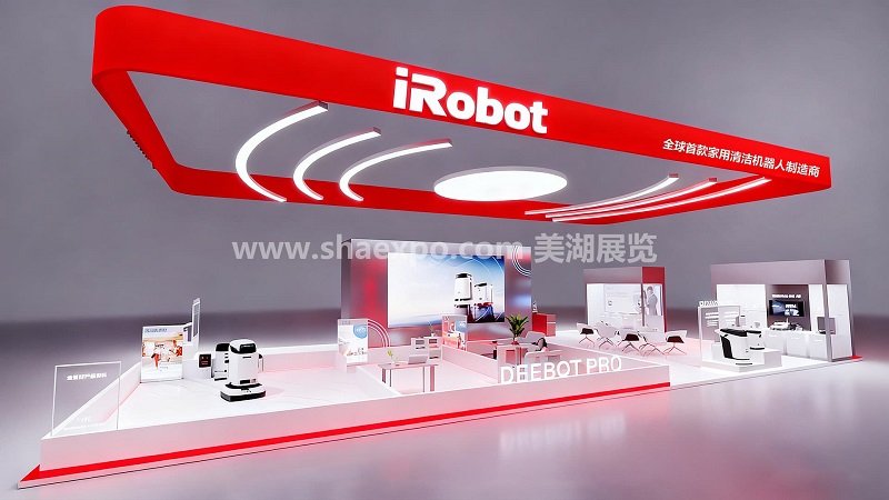 展臺最醒目的設(shè)計是頂部的紅色懸浮式燈箱結(jié)構(gòu),大面積紅色與白色 “iRobot” 品牌標識形成強烈視覺沖擊,搭配 “全球首款家用清潔機器人制造商” 的品牌定位語,在遠距離就能完成品牌信息傳遞。燈箱底部嵌入的環(huán)形燈帶與弧線造型,既呼應(yīng)了機器人導航的科技屬性,也為空間增添了動感與層次。